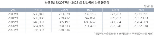 2001년 120만t이었던 인천공항 항공화물 물동량은 매년 실적이 점차 개선되면서 2007년 255만t까지 기록했다. 지난 2008년 미국 금융 위기 여파로 물동량이 2009년 231만t까지 하락하기도 했다. 다만 전 세계 경기가 점차 회복되면서 지난 2018년엔 개항 후 최대 실적인 295만t을 달성하는 등 소폭의 등락을 거듭하면서 전반적인 실적 상승 추세에 있다.