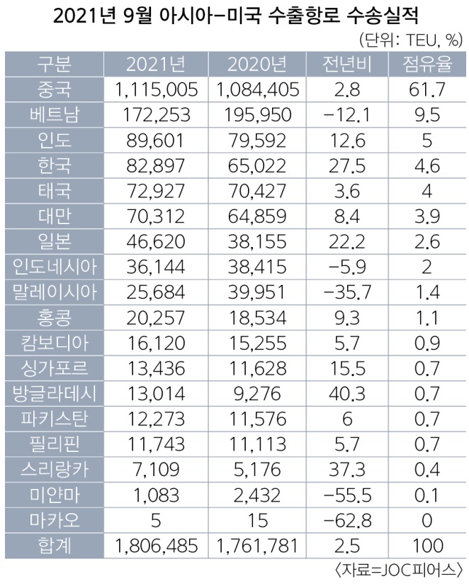 미국 해운조사기관인 JOC피어스에 따르면 2021년 9월 아시아 18개국발 미국행(북미수출항로) 컨테이너 물동량은 180만6500TEU로, 1년 전 176만1800TEU에 견줘 2.5% 증가했다. 9월 실적으로는 역대 최대치다. 지난 8월 14개월 만에 상승세를 마감한 북미항로 수출물동량은 다시 증가세로 전환했다.