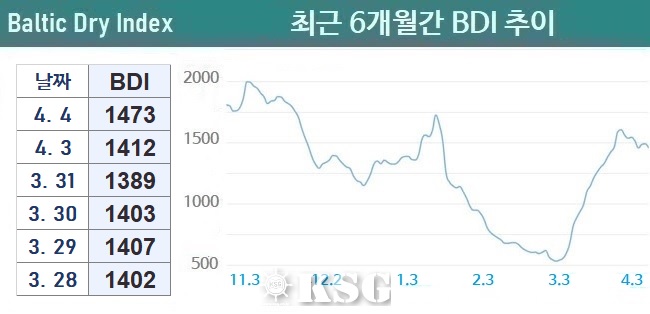4월4일 건화물선 운임지수(BDI)는 전일보다 61포인트 오른 1473으로 마감됐다. 이날 벌크 시장은 전일과 동일한 시황이 계속됐다. 중대형선 시장에서는 상승세를 이어간 반면 소형선 시장은 약보합세가 지속됐다. 한국형 건화물선 운임지수(KDCI)는 4월4일 기준 1만4717달러로 전일보다 262달러 상승했다.